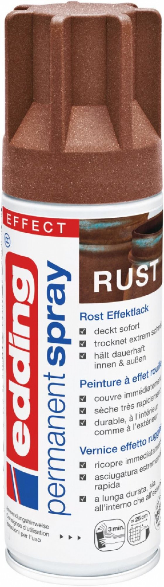 Vernice permanente di alta qualità Edding 5200 con texture ruvida e aspetto visivo di ruggine con straordinarie capacità di copertura, asciuga estremamente rapidamente ed è durevole anche all'esterno. È adatta per tutti i lavori di fai da te e artigianato su superfici come metallo, pietra, carta da parati, tela, vetro e ceramica. Il volume di 200 ml copre circa 0,7-1 m². Non è compatibile con gli spruzzatori di ricambio Edding (disponibili separatamente).