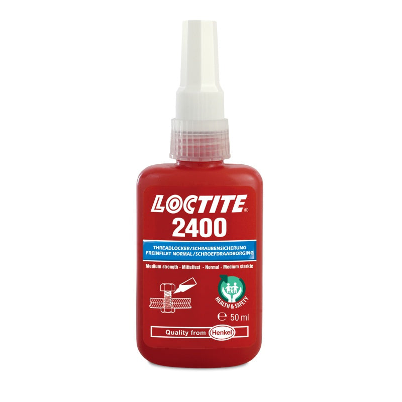 L'adesivo per viti Loctite 2400 è un prodotto di media resistenza che garantisce e sigilla i filetti. In particolare nell'industria, gli adesivi per giunzioni filettate sono molto importanti, poiché il rilascio spontaneo di una vite può causare grandi problemi. Gli adesivi si induriscono nella giunzione del filetto e lo proteggono dall'allentamento, sigillando anche. Loctite 2400 è progettato principalmente per filetti che devono essere smontati frequentemente. Un grande vantaggio è la buona resistenza alle temperature elevate, fino a 150 °C, e resiste anche a sostanze chimiche comuni. Si consiglia di utilizzare Loctite 2400 principalmente su filetti e viti metalliche.
