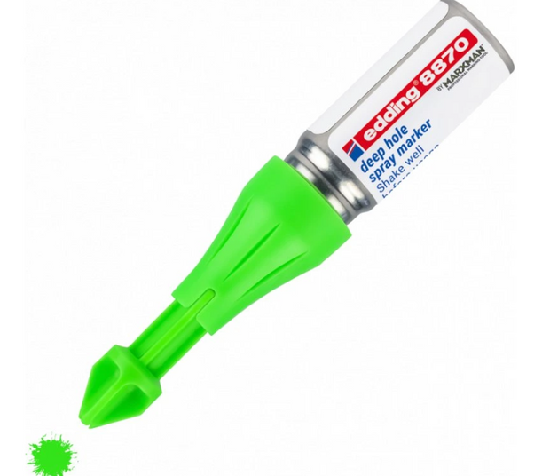 Strumento unico per la marcatura rapida, facile e precisa dei fori, anche in luoghi di difficile accesso. Questo marcatore spray funziona grazie a un meccanismo brevettato che spruzza gesso verde neon con una semplice pressione, indipendentemente dall'angolo di lavoro.