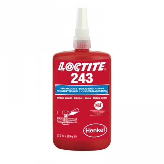 Loctite 243 è un efficace bloccante per filetti che indurisce nello spazio tra due superfici metalliche, senza accesso all'aria. Dopo l'indurimento, blocca e sigilla le giunzioni filettate. Sebbene, dopo l'indurimento, il bloccante sia resistente e prevenga sia la rottura della giunzione che il suo allentamento o infiltrazione, può essere successivamente smontato piuttosto facilmente con attrezzi manuali, ad esempio durante una revisione periodica. La sua composizione è più adatta per superfici meno attive, come l'acciaio inossidabile o superfici placcate. Un grande vantaggio è la caratteristica tissotropica, che dopo l'applicazione del bloccante Loctite 243 impedisce il gocciolamento dal punto di applicazione. La resistenza termica del bloccante è fino a 180 °C.
