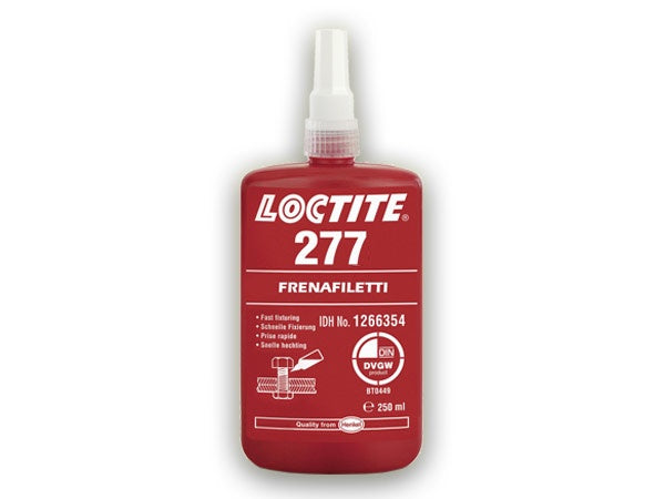 Loctite 277 è un adesivo per filetti ad alta resistenza, utilizzato per sigillare e fissare permanentemente le giunzioni filettate, raggiungendo una buona resistenza e durabilità dopo la polimerizzazione. Polimerizza senza accesso all'aria tra due superfici metalliche. Loctite 277 è progettato principalmente per filetti di grandi dimensioni, ma può essere utilizzato anche su giunzioni filettate standard, tenendo conto di una viscosità più alta. Dopo la polimerizzazione, previene crepe, allentamenti o il completo distacco delle parti incollate. È adatto per il fissaggio e la sicurezza di grandi viti strutturali e simili. Un vantaggio è anche la sua resistenza al calore, fino a 200 °C.