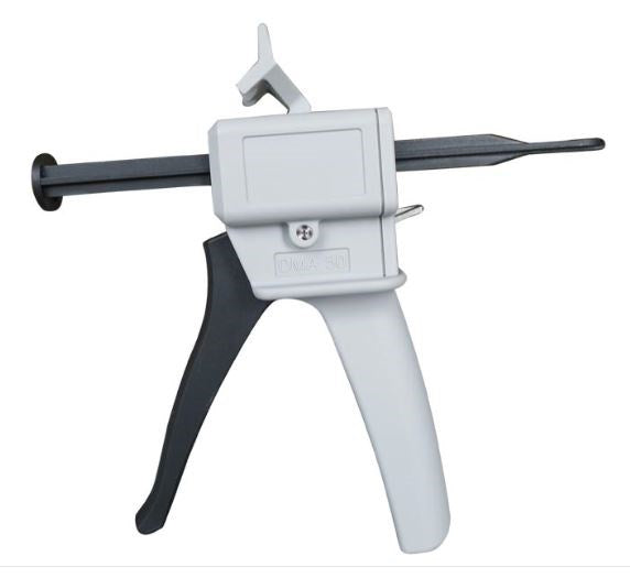 Pistola manuale per l'applicazione di adesivi poliuretanici bicomponenti come SikaPower 2950 e SikaPower 2955 in 50ml (2x25ml, rapporto di miscelazione 1:1).