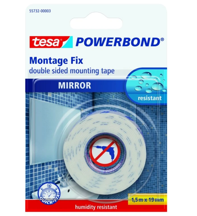 Montážní páska Tesa Powerbond MIRROR je oboustranná samolepicí páska, která má obzvláště silnou přilnavost dokonce i v místnostech s vyšší tvorbou vlhkosti, jako jsou koupelny či kuchyně.